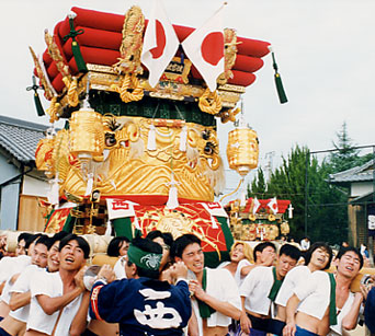 黄金の阿吽双龍の 豪華な幕と炎の様な 緋羅紗地に純金色で 大蜘蛛を躍動的に 縫い上げた高欄掛とが 調和のとれた絢爛な 屋台を飾り 町衆と共に祭りを 盛り上げています。