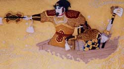姫路市「灘のけんか祭」で知られる 宇佐崎屋台の高欄掛を 立体刺繍技法にて縫い上げ 勇壮で迫力ある作品に仕上げました。 |