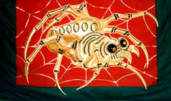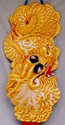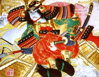 姫路市「灘のけんか祭」で知られる 宇佐崎屋台の高欄掛を 立体刺繍技法にて縫い上げ 勇壮で迫力ある作品に仕上げました。 |