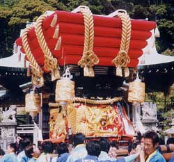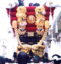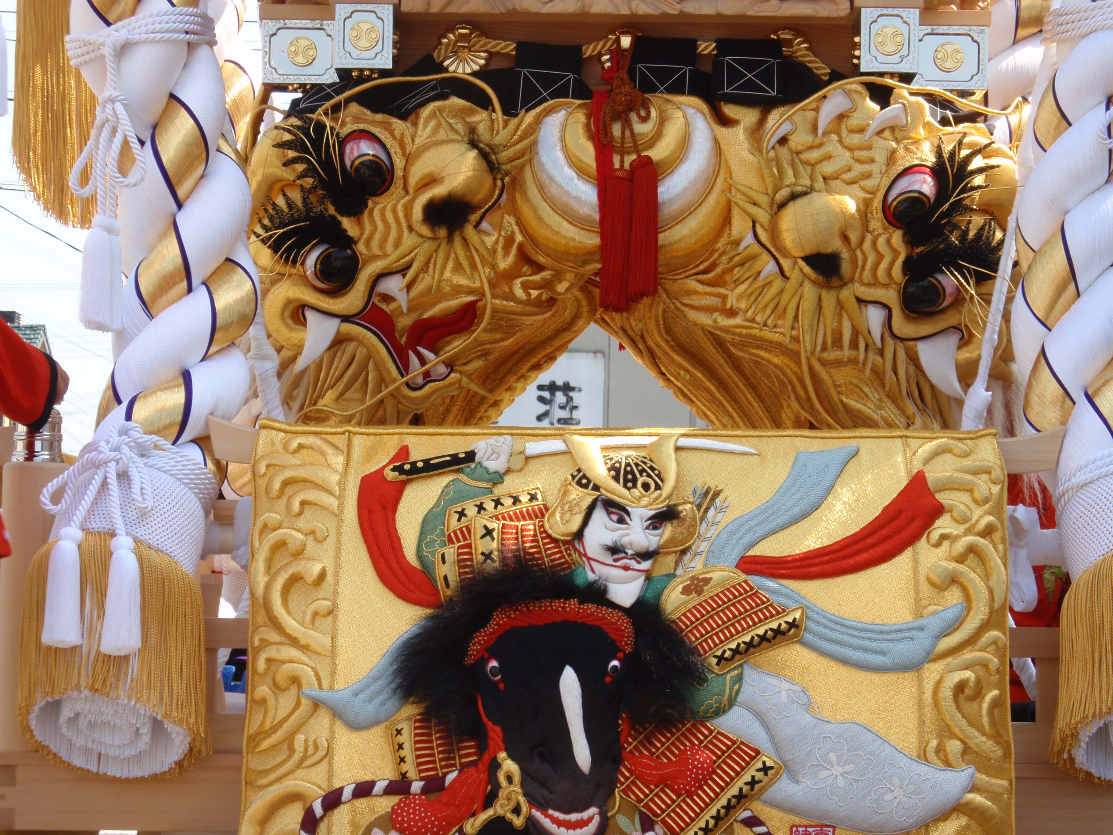 黄金の阿吽双龍の 豪華な幕と炎の様な 緋羅紗地に純金色で 大蜘蛛を躍動的に 縫い上げた高欄掛とが 調和のとれた絢爛な 屋台を飾り 町衆と共に祭りを 盛り上げています。