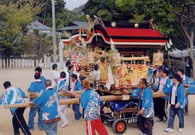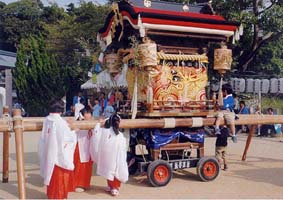 この水引幕は古瀬の縫師絹常氏が 60年余前に製作した逸品を 10ヶ月の月日を費やし 旧幕に恥じない様に復元新調し 平成11年秋祭りに披露され高い評価を得ました。 また旧幕は平成12年夏 姫路市書写の里・美術工芸館にて展示され 図柄、総刺繍技術共に賞賛され 記念写真集の表紙に用いられました。 |