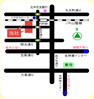 ■ お車でお越しの方 ■ 名神高速道路京都南インターより 名神高速道路京都東インターより どちらからも約30分ぐらいです。 姫路方面より車で100分位いです。 ■ 各種交通機関ご利用の方 ■ JR京都駅にて山陰本線乗り換え JR円町駅下車 徒歩3分 京阪三条駅より 京都市バス 15号 円町バス停下車 阪急西院駅より 京都市バス 205号 202号 204号 円町バス停下車 |